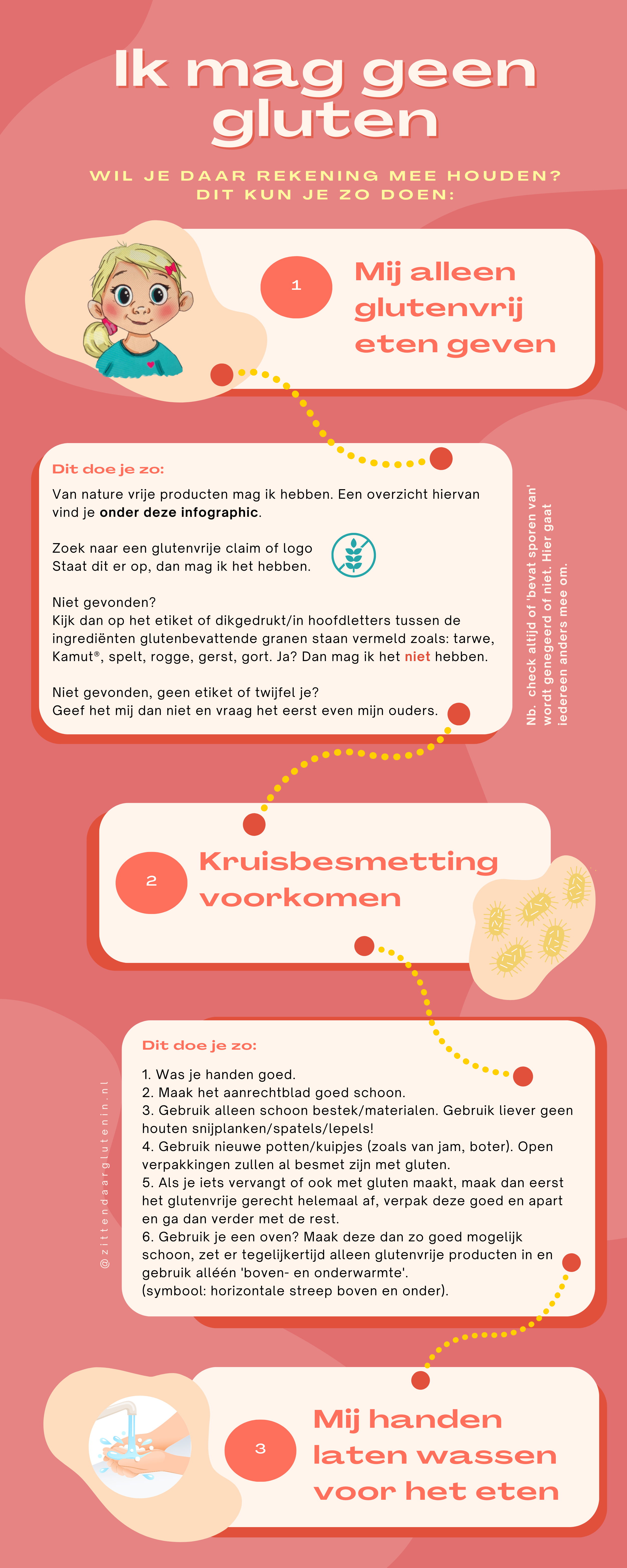 Het 'Ik ben glutenvrij' document. Een handig invuldocument dat je kunt geven aan de juffen, meesters en de ouders van de kinderen uit de klas. Vraag de juf of meester om dit door te sturen aan alle ouders, dan is meteen iedereen goed op de hoogte en kúnnen ze ook rekening houden jouw kind. Want vaak is de wil er wel, maar ontbreekt de kennis. Totaal niet gek, want tot de diagnose wist er ik ook nog maar zeer weinig van af. Je kunt het bestand aanpassen en nader aanvullen/ concretiseren.